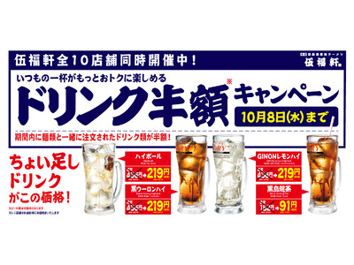 【ラーメンとヤキメシの店"伍福軒"】『ドリンク半額祭り』が 9/10(水)から全店同時開催!