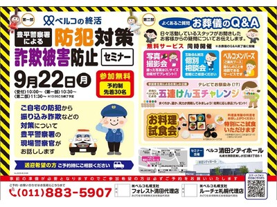 【参加無料予約制】「豊平警察署による防犯対策セミナー」と「お葬儀のQ&A」同時開催 この度、札幌市清田区のベルコ清田シティホールにて、9月22日に地域住民の皆様の安全を守るための特別イ...