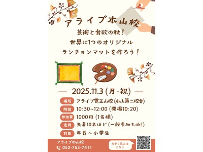 芸術と食欲の秋!外国人の先生と英語で楽しみながら、世界に1つのオリジナルランチョンマットを一緒に作ろう! 株式会社アライブ(愛知県名古屋市、代表取締役:三井博美)が運営するアライブイングリッシ...
