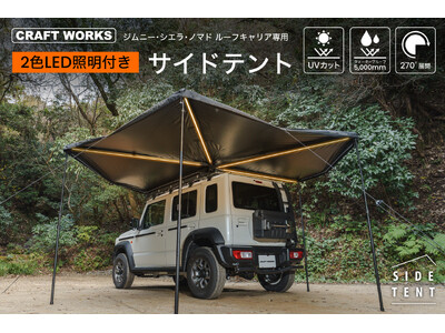 【ジムニー・シエラ・ノマド】専用 一生モノの『サイドテント』販売開始。2色LED切り替え機能搭載で、夜も楽しめる。展開5分で準備は短く、楽しみは長く。アウトドア好きにおすすめの本物設計です。
