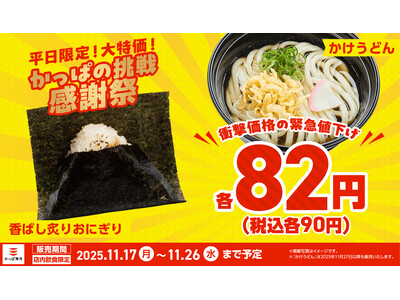 【かっぱの挑戦 感謝祭】「おにぎり」と「うどん」が、衝撃価格の各82円(税込各90円)に11/17(月)~緊急値下げ!!平日限定・終日・かっぱ寿司全店にて