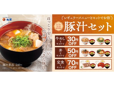 定番メニューと、ほっこり安らぐ味わい松屋の具だくさん豚汁をセットに。 2026年3月3日(火)10時~ 販売開始 このたび松屋フーズ(本社:東京都武蔵野市、代表取締役社長:瓦葺一利)では、牛め...