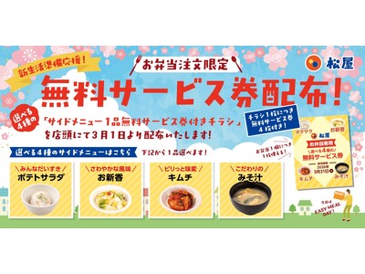 【松屋】みなさんの新生活準備を応援! テイクアウト限定! お得な「サイドメニュー1品無料サービス券付きチラシ」配布開始