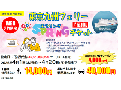 旅行企画実施 株式会社ヴィーナストラベル 桜花爛慢の季節を迎える4月、東京九州フェリーより4月乗船55歳以上限定のお得な商品が発売いたしました。 片道乗船券に、マルチクーポン4,000円分が付...
