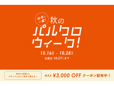 何度もお得で、毎日楽しい!パルが贈る半年に一度の"秋の祭典"をどうぞお楽しみください! 10/16 ~10/28(お店は10/27まで)の期間、パルグループの各店舗&パルクローゼットオ...