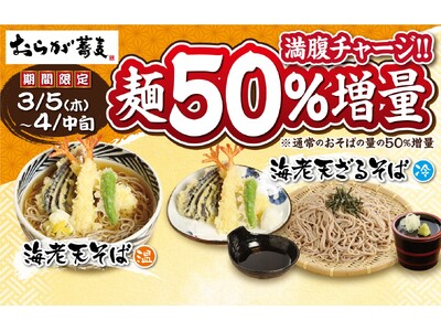 【おらが蕎麦】全力応援!! 期間限定「満腹チャージ!! 麺50%増量」キャンペーンを3月5日(木)より実施します。
