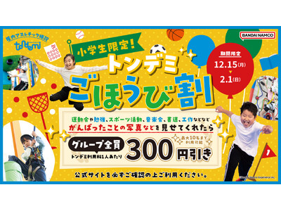株式会社バンダイナムコエクスペリエンスが企画プロデュースする屋内アスレチック施設『トンデミ』にて、2025年12月15日(月)~2026年2月1日(日)の期間中、小学生のお子さまがテストや習い...