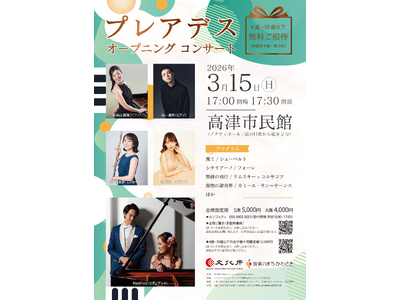 『プレアデス オープニング コンサート』が2026年3月15日 (日)に高津市民館(神奈川県 川崎市高津区 溝口 141)にて開催されます。 チケットはカンフェティ(運営:ロングランプランニン...