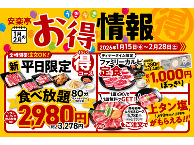 焼肉レストラン「安楽亭」(本社さいたま市)では、2026年1月15日(木)から2月28日(土)までの期間限定でお得フェアを開催。ご家族やご友人とのお食事、気軽に焼肉夜ご飯までお得を多数ご用意致...
