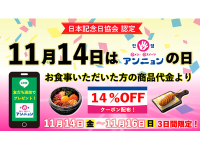 ~ LINEお友だち登録で14%OFFクーポン配布!~ 株式会社 焼肉坂井ホールディングス(本社:名古屋市北区、代表取締役社長 高橋仁志)は毎年11月14日を「韓メシ韓スイーツ 「アンニョン」...