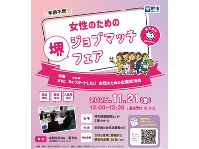 女性を応援する堺の企業と出会える企業交流会を開催します。 堺市では、女性の雇用促進を図るため、さかいJOBステーション主催の「堺ジョブマッチフェア」を開催します。女性の採用に積極的な企業10社...