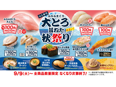 株式会社はま寿司(代表取締役社長:町野 岳 本社:東京都港区)が展開する100円寿司チェーン「はま寿司」は、9月9日(火)より、「はま寿司 みなみまぐろ大とろと旨ねた秋祭り」を全国の店舗で開催...