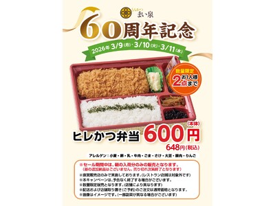 井筒まい泉株式会社(東京都港区、代表取締役社長 國弘克英)は、2026年3月9日(月)10日(火)11日(水)までの3日間、まい泉直営販売店にて「ヒレかつ弁当」を特別価格で販売いたします。 お...
