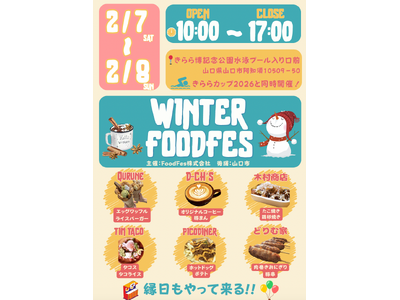 冬に嬉しいたこ焼きや肉まんからスイーツまで6店舗が集結 FoodFes株式会社(代表取締役:稲垣一馬)は、2026年2月7日(土)8日(日)の2日間、山口きらら博記念公園水泳プール入り口(山口...
