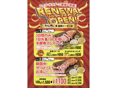 【やっぱりステーキ】やっぱりステーキ 静岡インター店がリニューアルOPEN!おいしさも、居心地もパワーアップ!11月14日から"半額&特別価格"のキャンペーンを実施