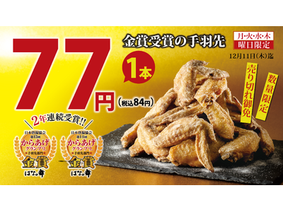 ~秘伝の神スパイスが決め手!からあげグランプリ(R)で過去、2年連続金賞受賞の「手羽先唐揚げ」。販売累計本数100万本突破を記念して、通常よりも112円お得に、1本77円で販売いたします。~ ...