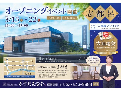 株式会社出雲殿互助会(所在地:浜松市中央区連尺町、代表取締役:岸本裕一郎)は、2026年3月13日、新たな家族葬ホール「出雲殿互助会の家族葬 志都呂」をオープンいたします。 また、オープンを記...