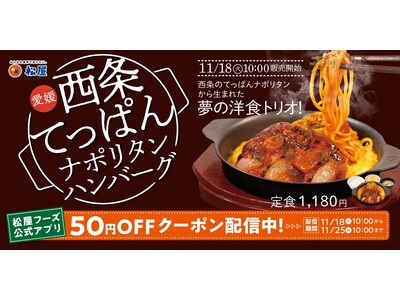 愛媛県西条市のご当地グルメを松屋流アレンジで全国へお届け! 熱々のナポリタンとハンバーグが生み出す"松屋流ごちそう洋食" 11月18日(火)10時~ 販売開始 このたび松屋フーズ(本社:東京都...
