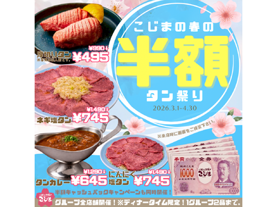 【3月1日~4月30日の期間限定】焼肉こじまグループ全店舗で、毎年大好評の 春のタン祭り開催を開催致します 全国の焼肉こじまグループで 2026年3月1日(日)~4月30日(木) の期間限定!...