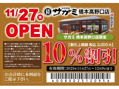 ~家族で楽しむ本格和食、11月27日(木)グランドオープン~ 株式会社サガミホールディングスのグループ企業であるサガミレストランツ株式会社(本社:愛知県名古屋市守山区八剣二丁目118番地 代表...