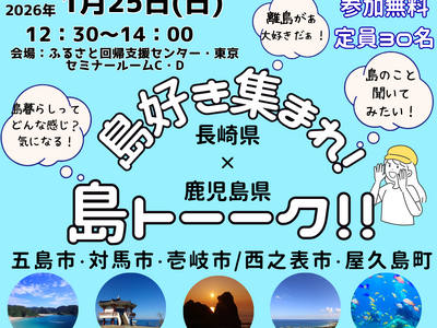 長崎県五島市は、1月23日「ながさきナイトサロン」、1月24日「九州山口沖縄移住フェア『暮らシゴト2026』」、1月25日「長崎県×鹿児島県 島好き集まれ!島トーーク!!」に参加します。 7年...