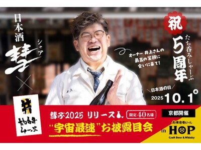 京都の大人気店「たち呑み しゃーぷ」のOPEN5周年を記念した、オリジナルの日本酒を限定発売。2025年10月1日(水)にお披露目会を開催します。