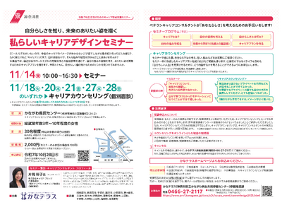 ~総就業年数3年~10年程度の女性の就業継続とキャリアデザインを支援するセミナーです~ かなテラス(神奈川県立かながわ男女共同参画センター)では、総就業年数3年~10年程度の女性を対象に、就業...