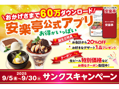 株式会社安楽亭(本社:埼玉県さいたま市)は、公式アプリの累計ダウンロード数が60万件を突破したことを記念し、2025年9月5日(金)~9月30日(火)まで「サンクスキャンペーン」を開催いたしま...