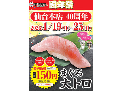 「平禄寿司」仙台本店 周年祭 1/19(月)~ 1/25(日)「まぐろ大トロ(一貫)」165円で提供いたします