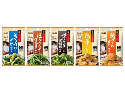 「賛否両論」笠原将弘氏監修 匠のおしながきシーズニング「きゅうりの花椒味噌和え」「ほうれん草の生姜ごま和え」「ブロッコリーの黒胡椒醤油」「鶏の柚子こしょう焼き」「鶏つくね カレー仕立て」2月3日新発売