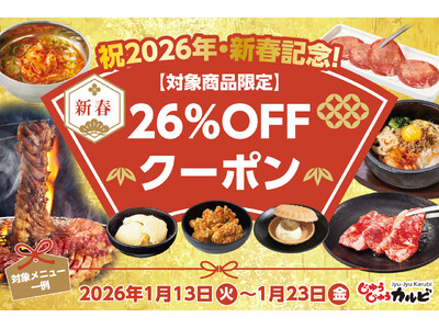 株式会社トマトアンドアソシエイツ(本社:兵庫県西宮市、代表取締役社長:笹村 啓介)が運営する焼肉食べ放題「じゅうじゅうカルビ」では、2026年1月13日(火)より、人気の12商品が26%OFF...