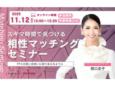 11月12日(水) 18時より、スキマ時間を活用して自分に合ったFPを探すことができる、間口史子講師との「相性マッチングセミナー(無料)」を開催いたします。 詳細はこちら 無料マネーセミナー提...