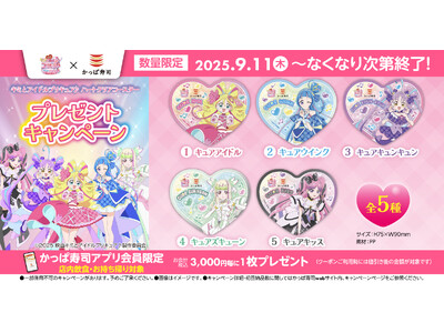 【アプリ会員限定】 「キミとアイドルプリキュア♪ハートクリアコースター」全5種プレゼントキャンペーン開催 2025年9月11日(木)~なくなり次第終了、かっぱ寿司全店にて コロワイドグループの...