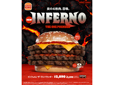 バーガーキング(R) から炎を纏った4枚肉『インフェルノ ザ・ワンパウンダー』新発売!直火焼きの100%ビーフパティ4枚とクセになる辛さの「燻製辛口ガーリックフレーク」が食欲をそそる超大型バーガー登場!
