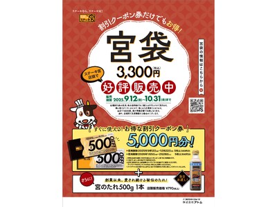 2025年9月12日(金)より店頭販売スタート コロワイドグループの株式会社アトム(本社:神奈川県横浜市、代表取締役社長:植田剛史)が展開するステーキ宮では、お得なクーポン券と宮のたれがセット...
