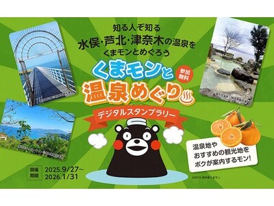 熊本県(知事:木村 敬)では、県南部の、水俣芦北津奈木地域を舞台に、くまモンと一緒に温泉をめぐる「くまモンと温泉めぐり デジタルスタンプラリー」を令和7年9月27日(土)~令和8年1月31日(...