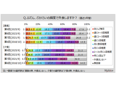 << TOPICS >> 直近1年間において、昼食時に外食した人は8割強、夕食時に外食した人は8割弱。依然としてコロナ禍前の2018年を下回る 直近1年間において、昼食...