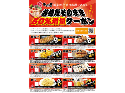 【創業26年分の感謝をこめて!】ラーメンまこと屋 次回使える『お値段そのまま50%増量クーポン』配布!無くなり次第終了!有効期限2025年11月1日(土)~12月31日(水)