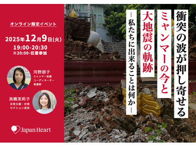日本発祥の国際医療NGOである特定非営利活動法人ジャパンハート(東京都台東区 理事長:吉岡春菜)は、12月9日(火)19時00分よりオンライントークイベント『衝突の波が押し寄せるミャンマーの今...