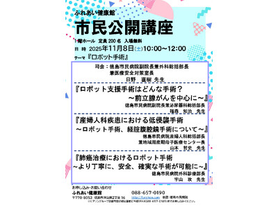 令和7年度 第2回徳島市民病院市民公開講座は「ロボット手術」をテーマに開催します。 【日時】 11月8日(土)10:00~12:00 【場所】 ふれあい健康館 1階 ホール 【内容】 テーマ:...