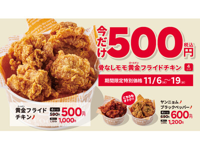 【bb.q オリーブチキン】今だけワンコイン!大人気「骨なしモモ黄金フライドチキン」4ピースが500円(税込)で楽しめる限定キャンペーン開催!