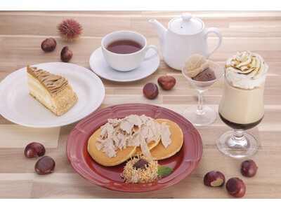 マロンスイーツ&ドリンク。どこから食べてもマロンバターが香るパンケーキや渋皮マロンアイスが入ったほうじ茶ラテが新登場