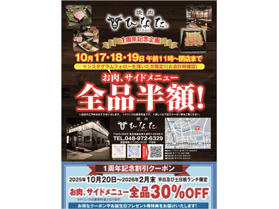 衝撃の1周年!!肉 & サイドメニュー全品半額フェア開催!!ご予約枠もあと僅か!!2026年2月末まで全品30% OFFのクーポンも配布!! 10月17日(金)~19日(日)