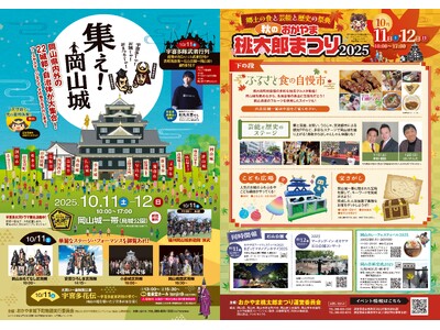 チラシ表 チラシ裏 岡山城一帯(烏城公園)で、「郷土の食と芸能と歴史の祭典」をテーマとする「秋のおかやま桃太郎まつり2025 」と県内外の城郭自治体が集結する「集え!岡山城」を同時開催します。...