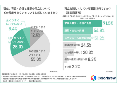「家庭内負担通勤スケジュール調整」が両立の三大課題、制度の存在と実際の活用のギャップ明らかに 株式会社Colorkrew(所在地:東京都台東区、代表取締役:中村 圭志)は、育児介護いずれかの経...