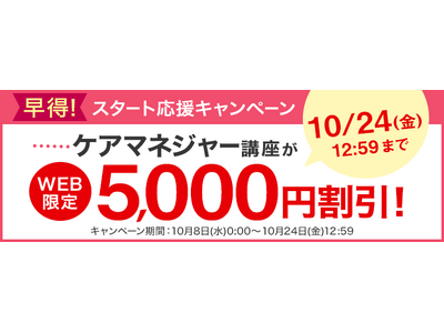 株式会社ユーキャンでは10/8(水)よりWEB限定キャンペーンを開始しました。10/24(金)12:59までWEBからの受講お申込みでケアマネジャー講座の学費を5,000円割引いたします。 通...