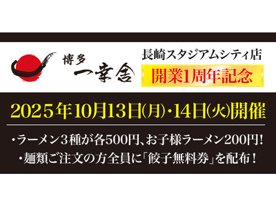 【元祖泡系博多一幸舎】 長崎スタジアムシティ店が開業1周年!2025年10月13日(月)・14日(火)の2日間は数量限定「ラーメン」1杯を特別価格の500円でご提供いたします!