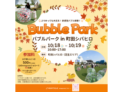 ぶつかっても大丈夫! バブルボールを活用した新感覚バブル体験イベントが町田シバヒロに登場! 株式会社Adaptique(所在地:東京都品川区、代表取締役:的場 秀)は、親子で楽しめる新感覚のバ...