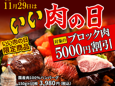 物価高でも塊肉で贅沢。「11/29【いい肉の日】キャンペーン2025」を開催。ブランド牛ブロック肉が5,000円OFF!さらに、お肉屋さんが作った国産肉100%ハンバーグを期間限定販売!