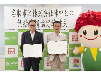 復興観光環境に根ざした地域連携で子どもたちの学びと地域活性化に貢献 包括連携協定締結式の様子(左:株式会社陣中 代表取締役 福山 良爾、右:名取市 山田司郎市長 ) 株式会社陣中(本社:宮城県...